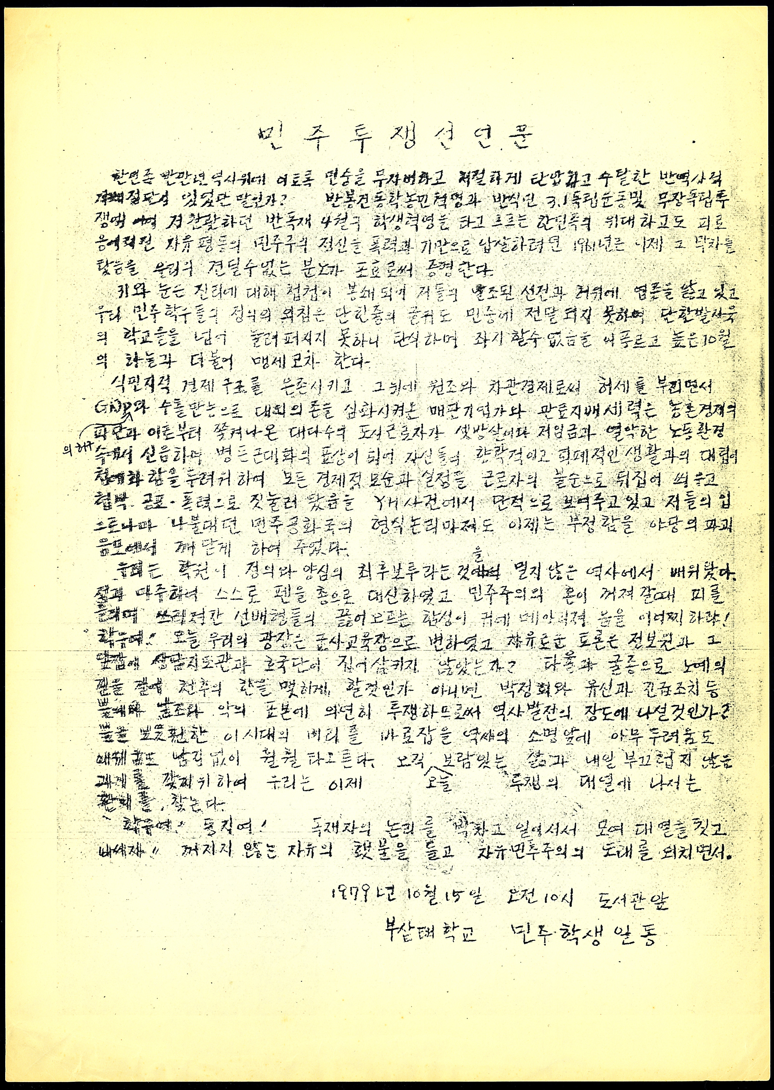 '유신철폐'의 함성이 외쳐진 부산대학교 학생들의 교내시위가, 유신체제를 무너뜨린 반독재 민주항쟁으로 확산된 주요 과정을 입체적으로 확인해보세요.